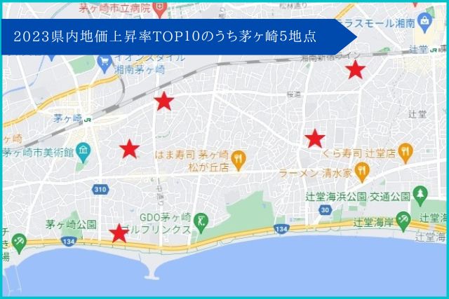 住宅地の地価上昇率TOP10のうち半数の5地点を茅ヶ崎市が占める結果となりました。いずれも、JR東海道線「茅ヶ崎駅」と「辻堂駅」の間、海側のエリアであることがわかります。