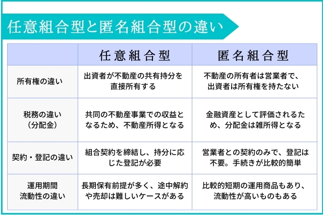 「匿名組合型」と「任意組合型」の主な違いを比較してみます。それぞれ仕組みや税務処理が異なるため、目的に応じた選択が重要です。