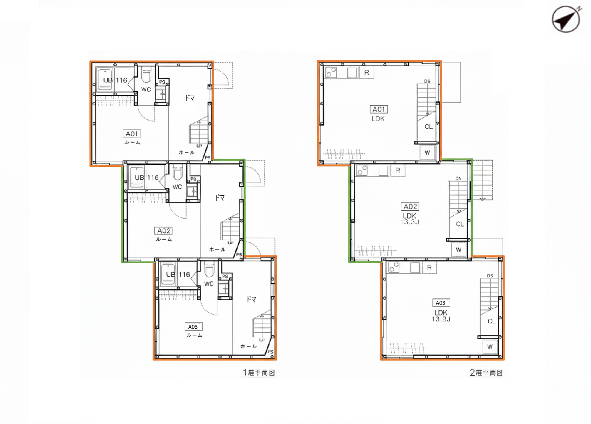 ■種類:長屋 ■構造・規模:木造2階建て(軸組工法) A棟/136.64㎡(41.33坪) B棟/136.64㎡(41.33坪) ■延床面積:273.28㎡(82.66坪) ■間取り:A棟B棟/1LDK×各3戸 ■各住戸の専有面積:45.54㎡ ■築年月: 2024年11月新築